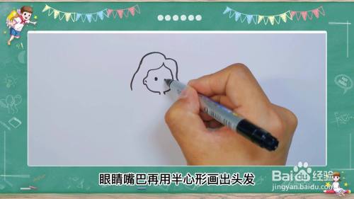 2画美人鱼身材 再用半心形画出头发,然后画美人鱼的身体,上面窄鱼肚宽,形状像梨一样,然后再画出鱼的尾巴,像水滴一样。