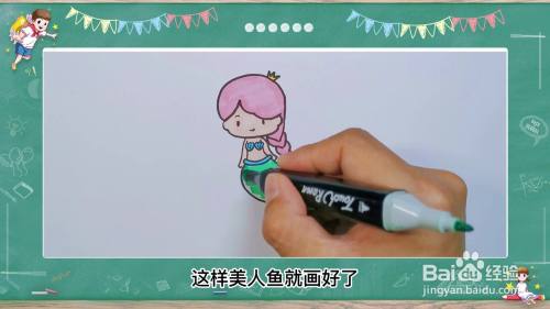 3给美人鱼各部分上色 最后给美人鱼涂上颜色,头发涂成粉色,脸和身体涂成肤色,尾巴涂成绿色,这样美人鱼就画好了。  END END