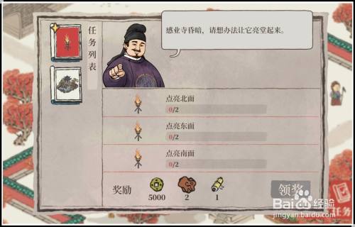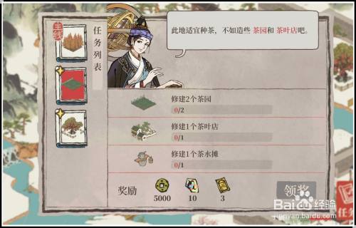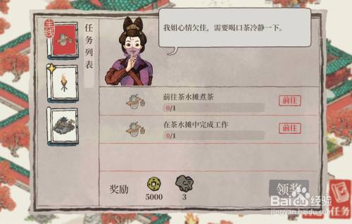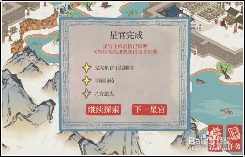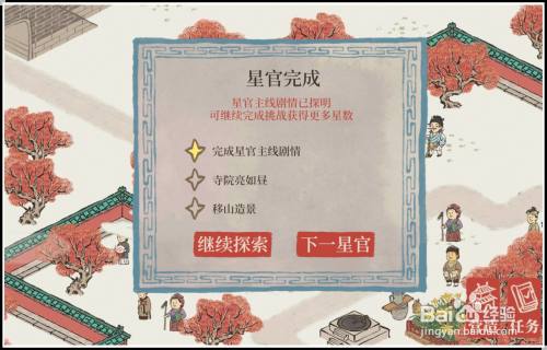 根据游戏右下角“任务”提示建造“茶水摊”并在这工作一次,帮助被门卡住的狄大人脱困完成主线剧情攒一颗星,选择开启下一个星官地图或继续探索当前任务。