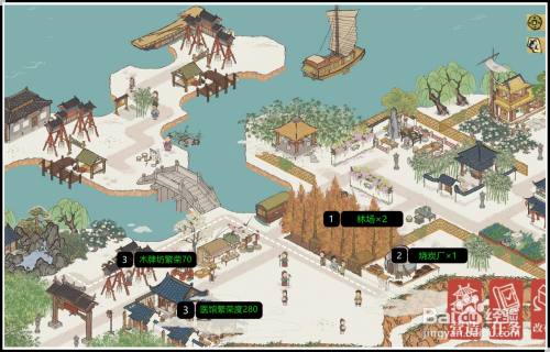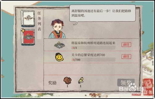 按照提示建造烧炭厂×1、林场×2,用“道路”将温泉与杭州桥连接起来、林场和烧碳厂也要与杭州桥连接,建造点娱乐类建筑物以增加当前地图的总繁荣度到700,完成繁荣度任务即可获三颗星。
