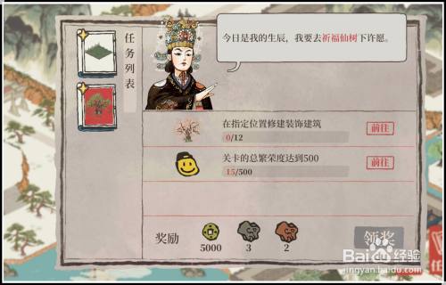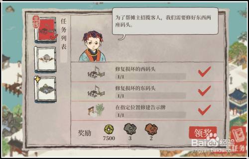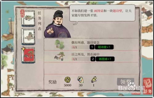 根据任务提示“偶有所感,题诗留念”、“目之所及,皆在画中”从其他州府码头运输题诗壁×1、画图桌×1,每个建筑要花24小时运;清理陨石坑5处可获得5个缩短建造时间的道具周加速票。