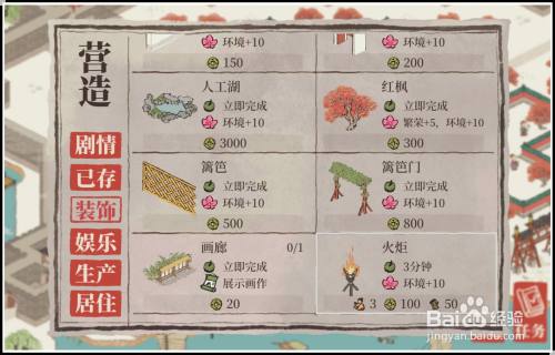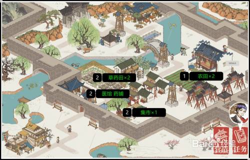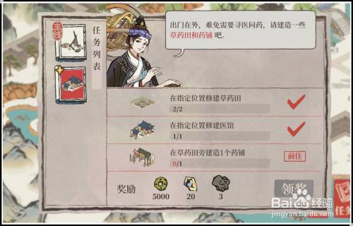 指定位置修建草药田、医馆和药铺,修建1个集市,“营造-居住”里建筑3个商业建筑(药铺已算入1个),建议直接建家具铺(30秒),总繁荣度须达到800才可完成全部任务。