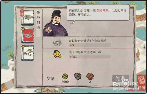第4个关卡亢要26级可进入星官,取到乡绅赵老的楠木盒子,调查珍宝馆,清理山路上的石坑,调查猎人家;修建1个说经台、旁边建造1个金陵琴派等,建造点娱乐类建筑物增加繁荣度到550。