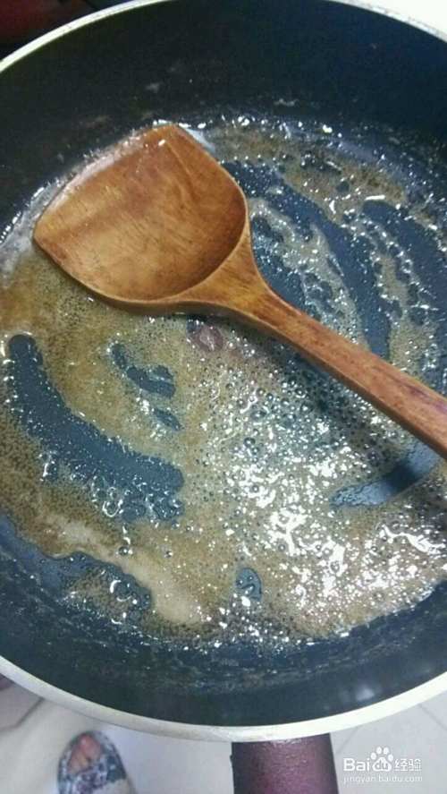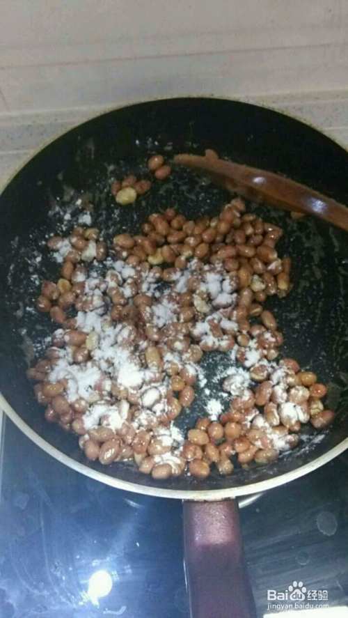 不要太大火,要有耐心哦,免得糖熬糊了,待糖和水变得浓稠了,就可以放入事先炒好花生了
