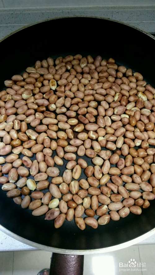 花生下锅小火翻炒七八分钟,花生表面有淡淡的油脂溢出,可以闻到花生的香味,关火出锅,晾凉。
