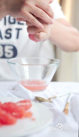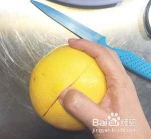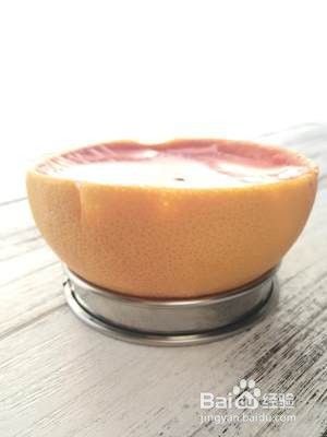 新鲜的西柚对半划开,保留完整的半圆型外壳,当然,想要省事的,可以去除这一步,完全就是用家里有的各种小杯子小容器就好了,那么就可直接剥皮