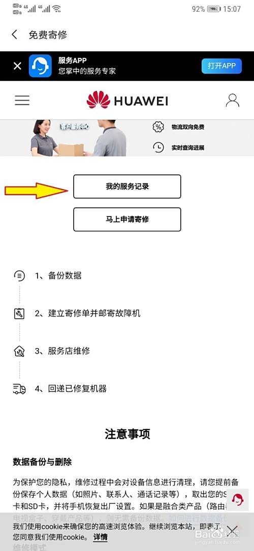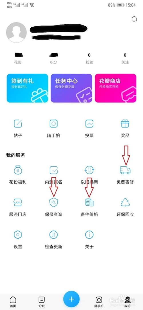打开花粉俱乐部,点击“我的”,查看手机是否在保修期,以及备件及维修费用。
