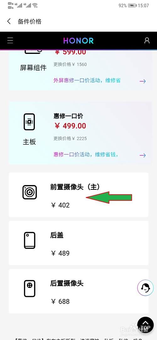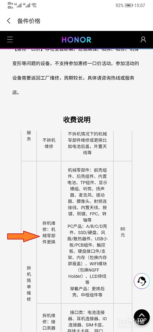 选择要查找的手机型号,清晰的显示备件及维修费用。