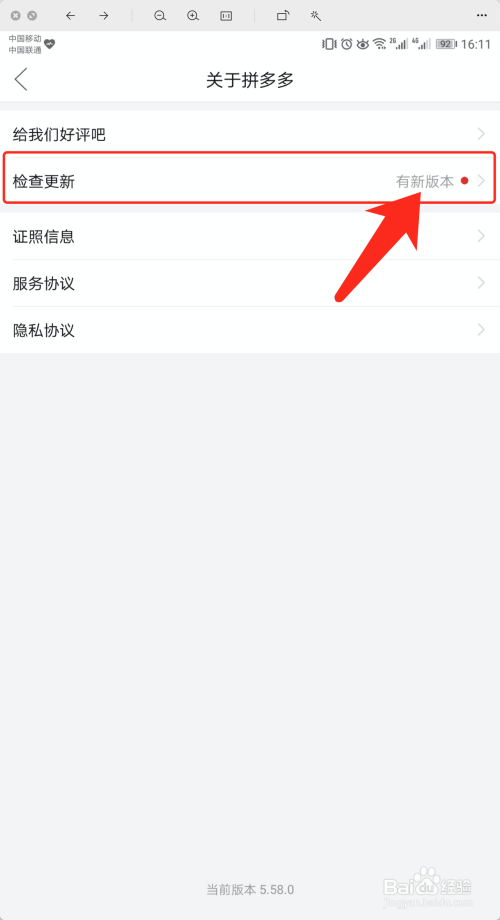 在关于拼多多中,点击【检查更新】(有新版本)。