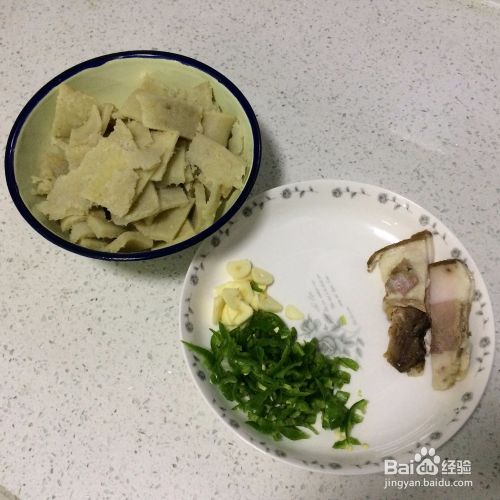 在拿出家里的腊肉,切上5片左右,记住要肥肉、瘦肉相连,如图所示。
