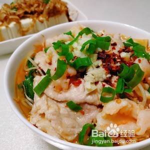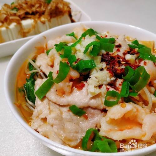 将干豆腐,豆芽菜,小青菜,放入烧好的低汤中,熟后捞出垫在碗底。 将刚才焯好的肉片,虾片,放入汤中入味,大概十秒钟左右捞出放到菜的上面。 在肉的上面撒上刚才准备好的辣椒面,蒜末,葱花,国内热油浇在上面,香喷喷的手锤版的水煮肉片就做好了。