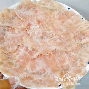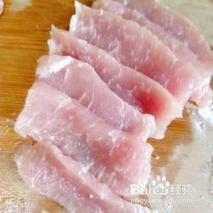 肉切片,两面沾淀粉,用擀面杖捶扁,慢慢捶不要太大力,淀粉稍微多一点,防止粘。