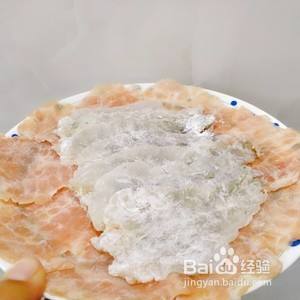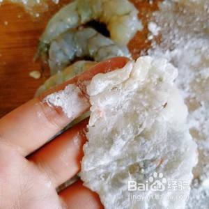 虾去皮,留虾头炒红油(不喜欢虾头可不留)。 虾背中间切开,蘸淀粉,用擀面杖捶扁。