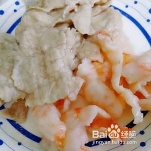 锅内放少许水,将虾片和肉片放入先烫熟,大概九秒左右即可。