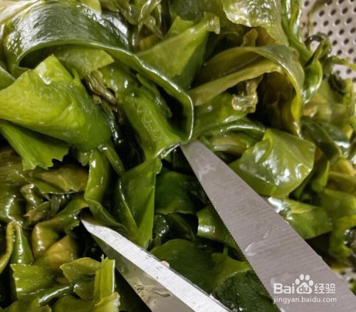 倒出水,并把海带用剪刀剪开。剪成小段的