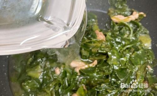 翻炒后,加入适量清水。水需要超过海带,因为是汤,所以需要多加点水。