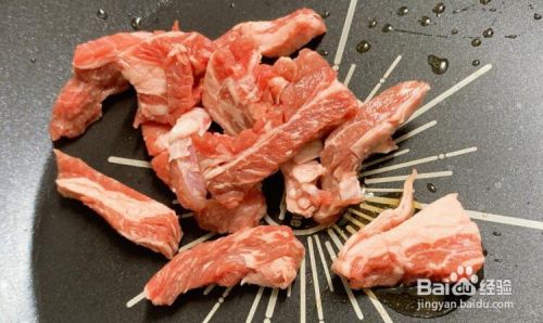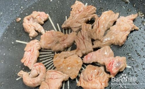 接着放入切好的牛肉块。煎至牛肉7分熟左右