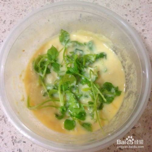 然后再放入一点绿叶菜苗。记得菜苗要嫩嫩的,而且为保证口感最好切碎哦