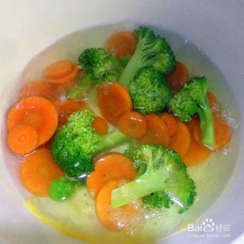 烧一点水,把切好的胡萝卜和西兰花放进去焯熟。差不多只要变色就可以了,先放西兰花,差不多再丢胡萝卜进去烫一下就好。