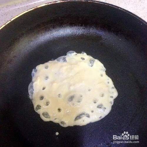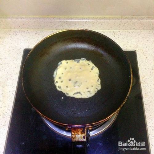 不粘锅底用油刷抹一点点橄榄油,把锅烧热以后舀一勺豆渣糊平铺入锅里,用勺底把豆渣糊摊平。一定要小火,不然很容易粘锅哦。