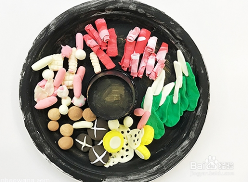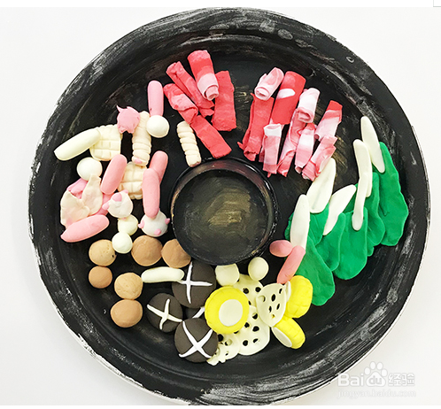 黑色的圆块状粘土表面粘上白色的“十”字,就是香菇了,再把黄色的柱状形粘土表层贴身白色的圆形,周围用工具压好,就是玉米,继续用白色和绿色粘土捏成菜叶