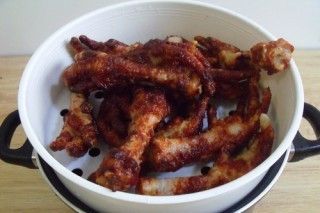 总结:1,鸡爪焯水后,要煮一会,煮半熟的鸡爪炸好才会外脆里嫩