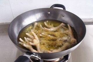 锅里烧油,油烧热迅速下入鸡爪。