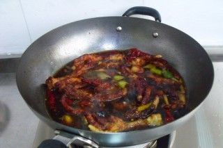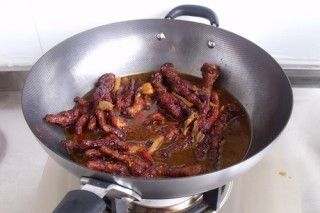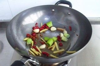 锅里的油倒掉,小火煸炒姜片,蒜,葱,辣椒,花椒,八角,放一茶匙五香粉炒均匀。