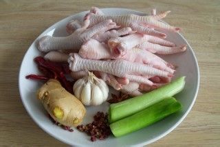 锅里放清水,用一半姜拍碎放入煮开,放鸡爪煮开,继续煮两分钟。