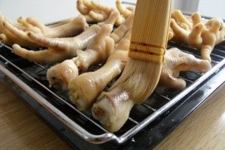 蜂蜜和白醋兑好,充分搅拌均匀。均匀的刷在鸡爪上,一面刷好翻面再刷。刷后晾干。