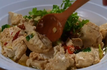 首先将老豆腐掰成小块,加盐和小葱煮6分钟左右
