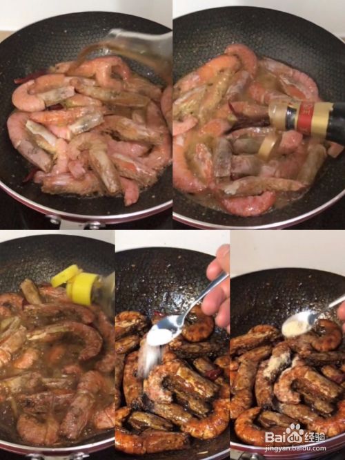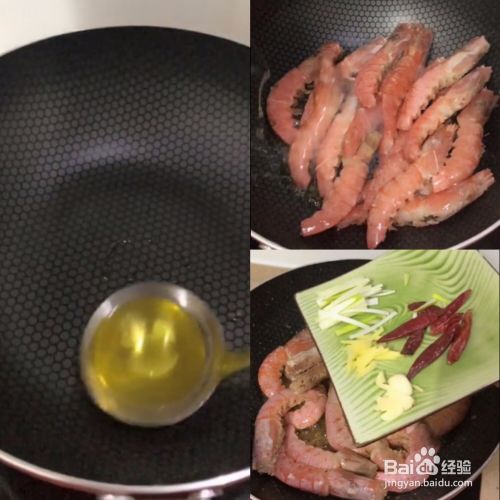 起锅烧油。油热后,把虾放入锅中翻炒,炒至虾变红色。然后放入葱、姜、蒜、干辣椒后继续翻炒至闻到香味。