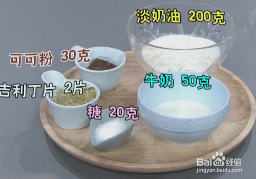 准备:牛奶50克,淡奶油200克,糖20克,可可粉30克,吉利丁片2片。