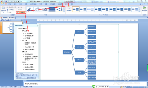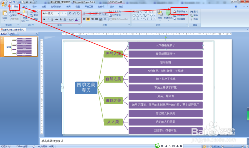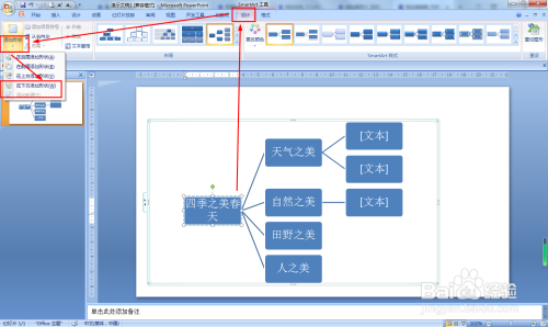SMARTART工具——设计——文本框——在每个二级分支后面按回车键,再按Tab键,添加下级文本——分别输入春天天气、自然、田野和人们美的地方。