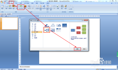 在菜单中选择插入——选择插图中的SMARTART——水平层次结构——确定。
