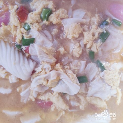 最后撒入大蒜苗,就可以出锅了。美味的西红柿三鲜鸡蛋豆腐皮汤,就做好了。