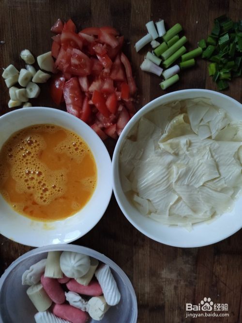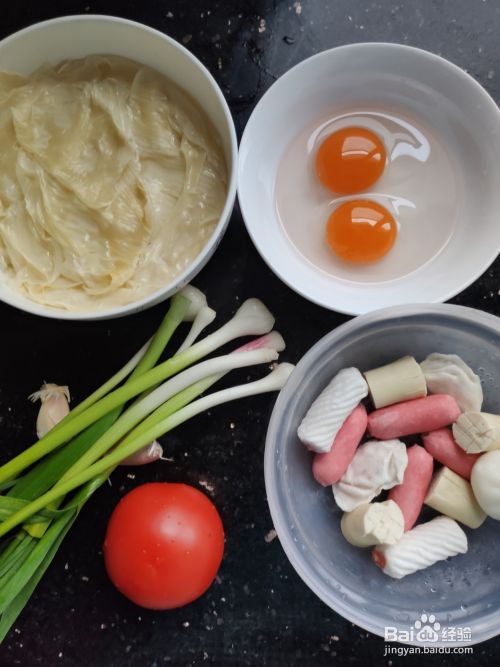 准备好材料,一个西红柿,两个鸡蛋,适量的三鲜,豆腐皮,大蒜和大蒜苗