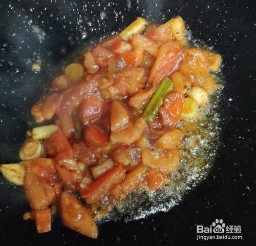 锅中倒入油,将大蒜和大蒜苗放入,煸炒出香味,再加入西红柿,翻炒至炒西红柿出水,加入适量的水和适量的盐