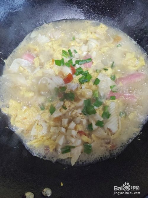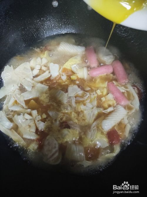 待水再次煮沸后,将打散的鸡蛋均匀的倒入锅中,再加入少许的酱油提鲜