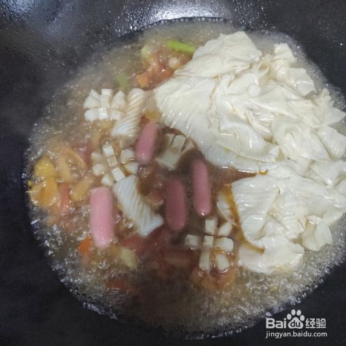 锅中水煮沸后,加入三鲜和豆腐皮,盖回锅盖