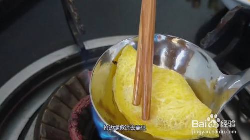 将勺子放在火上边烧边转,微微凝固后,放入肉馅,将边缘掀过去盖住。
