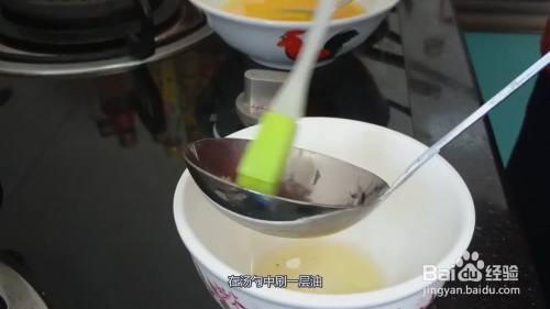 碗中打入四个鸡蛋,加盐后打散,在汤勺中刷一层油,倒上蛋液。