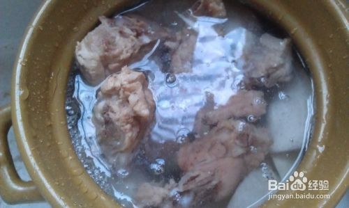 砂锅内放入适量的清水,放入白萝卜块,再把焯烫过的猪骨头放入。