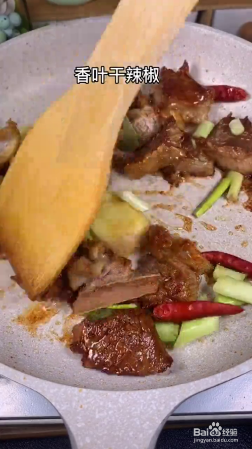 牛肉裹上糖色下葱姜桂皮八角香叶,干辣椒炒出香味
