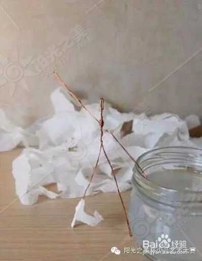 准备足够的餐巾纸,将餐巾纸撕成条条状,并将纸条蘸水,一条条粘贴、固定在铜丝上。