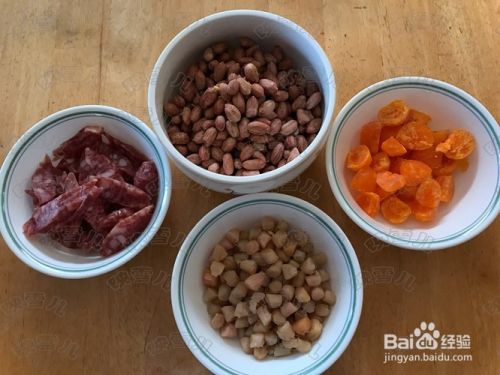 放入2汤匙的米。五花肉1块,瑶柱2小粒,冬菇1小块,咸蛋半个,花生6粒,腊肠一片。
