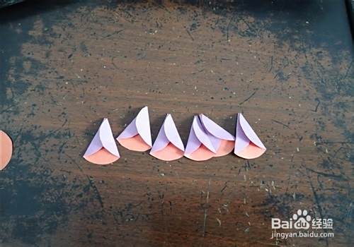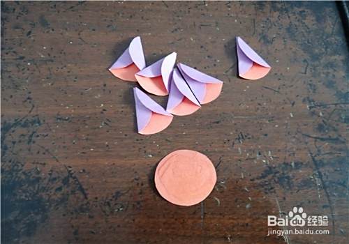 把一张圆形上面涂上胶水,我们把花瓣粘在上面,不够的话,我们可以再剪两个圆形,如图所示。