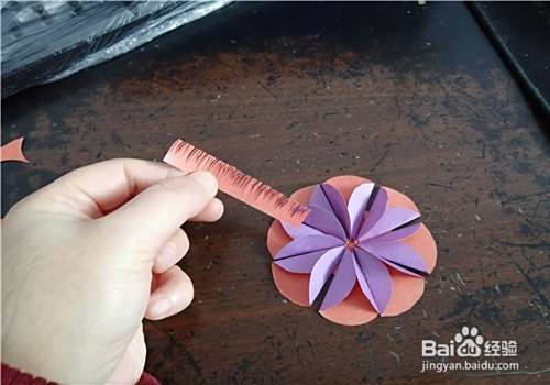 我们把一根长条纸剪成穗子,卷起来,用胶水把它粘在花朵的中心位置。