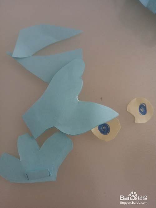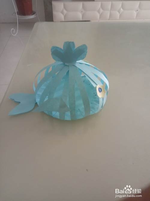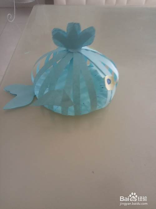 使用颜色分明的卡纸剪出鲸鱼的眼睛并画出。另外剪出和鲸鱼身体相同颜色的鱼尾和前鱼鳍,在剪出喷出水花。