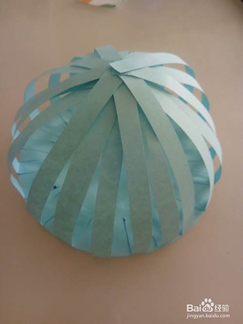 将长条的底部固定在圆形卡纸上,长条另一段相互黏连。组成镂空的半圆球。